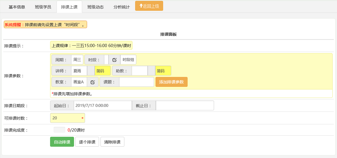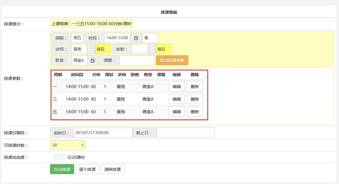 上图中设置的是按一三五规律上课的排课参数。我们可以按周期、时间段、教室、讲师任意组合排课参数。即可以一次性按此规律排完所有的课时,也可以根据排课截止日或可排课时数进行分阶段排课。