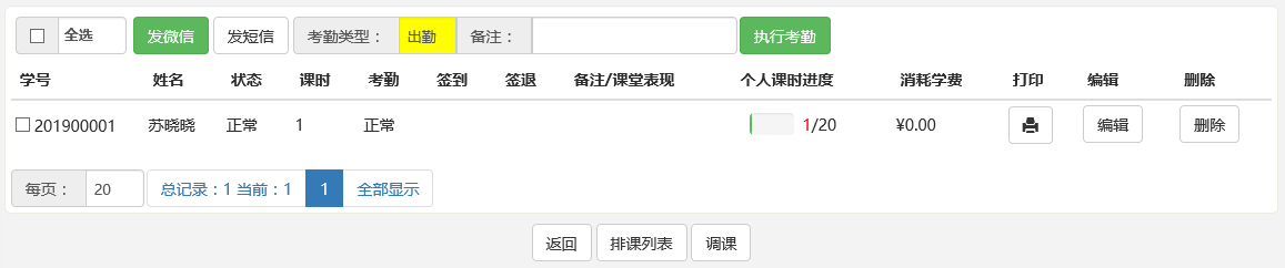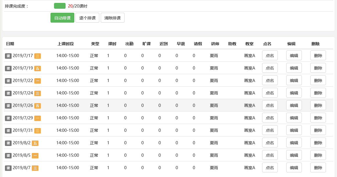 设置好排课参数后点击【自动排课】系统将自动生成所有的上课课次。选择某日期点击后面的【点名控制】进入考勤界面。