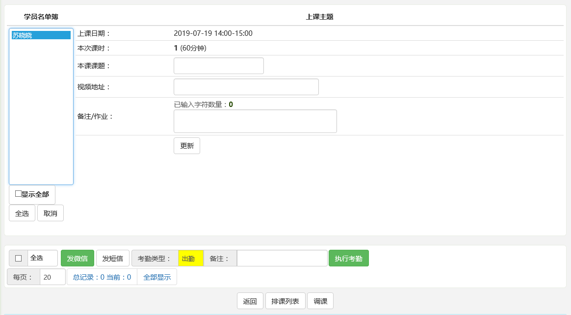 选择左边的学员名单(可多选)点击【执行考勤】即可完成对学员的考勤处理。