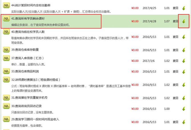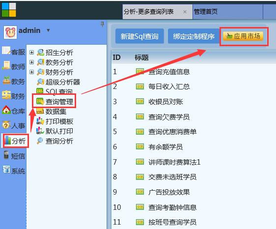 到【分析】-【查询管理】-【应用市场】,下载编号41查询所有学员剩余课时。安装完,回到【分析】-【查询管理】列表,直接点击这个查询名称即可查询(编辑这条查询,可以设置权限出现位置,可以给哪些账号使用,哪些不可以使用)。