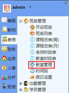 开设班级一般属于教务工作人员权限,开设班级前首先要设置上课教室,请打开【教务】→【班级管理】→【教室管理】: