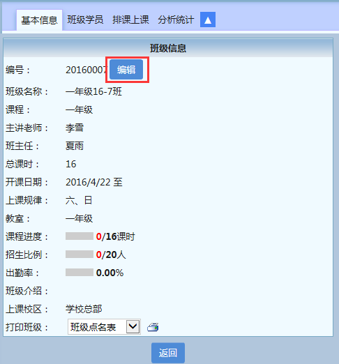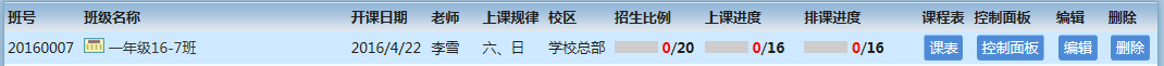开设好班级后,就可以排课及给学员选班了,具体操作请参看“如何排课?”、“如何选班?”;如果需要修改班级信息,可在【班级管理】→【班级列表】处,直接编辑此班级即可。或者单击“控制面板”,在“基本信息”栏编辑。