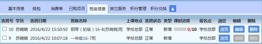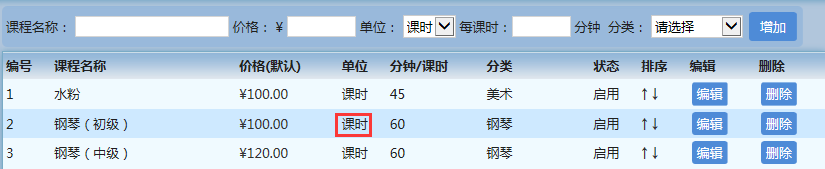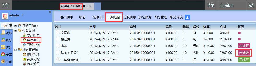 首先,请打开【系统】→【课程设置】,以“课时”为单位开设相关课程,比如“钢琴(初级)”,课程单价是100元/课时,课时分钟数是60分钟/课时。然后客服就可以在收费的时候,选择此课程,输入学员所报课时数增加即可。收费后打开【客服】→【报名客服】→【学员列表】的“控制面板”→“已购项目”或者【教务】→【学员管理】→【选班处理】,直接点击“未处理”进入个人班开设面板,开设好后可以在学员的班级信息里查看。