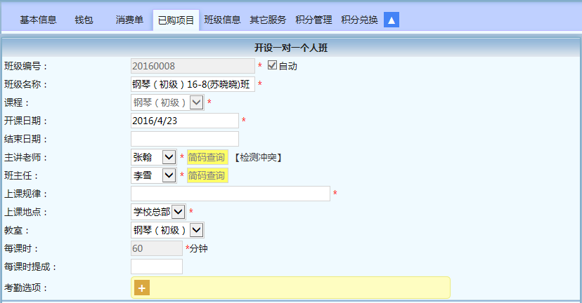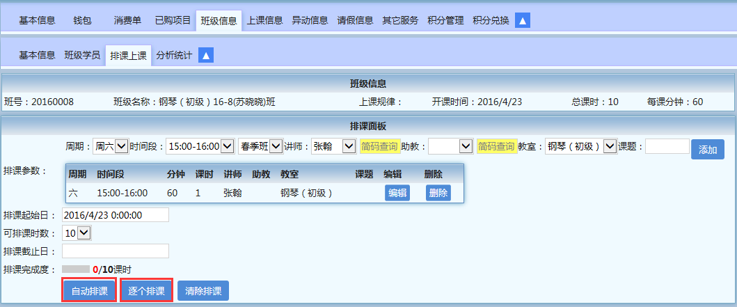 个人班排课:请打开【教务】→【学员管理】→【学员列表】→控制面板→班级信息→点班级名称进入→点排课上课,也可以在【教务】→【班级列表】→找到这个班级→【课程表】进入排课操作面板,如果此个人班上课有规律,可设置排课参数添加规律后使用“自动排课”,如果没有规律,可使用“逐个排课”;排课后老师就可以点名了或者使用刷卡考勤。