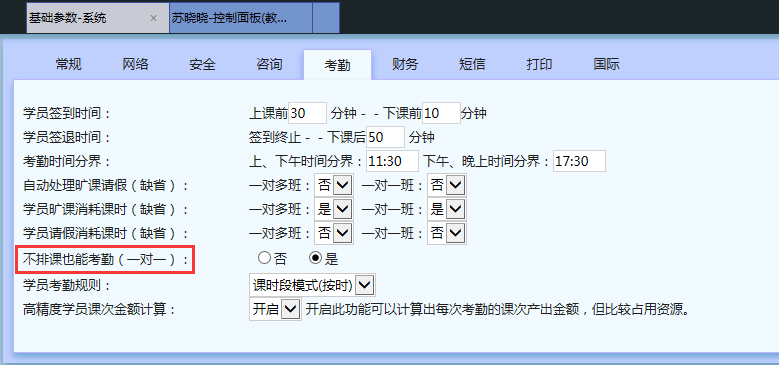 系统针对一对一课时制教学模式还有一种特殊的考勤方法,就是支持不排课也可以考勤,您需要到【系统】→【基础参数】→【考勤】设置一下,选择“是”即可: