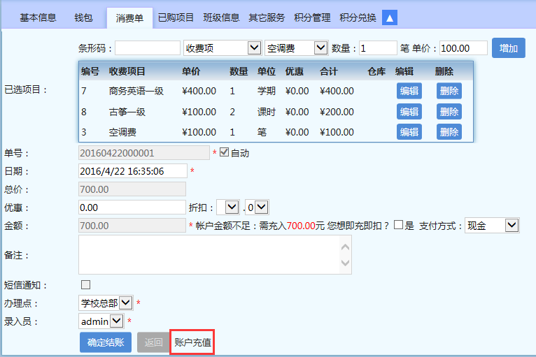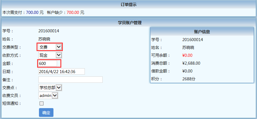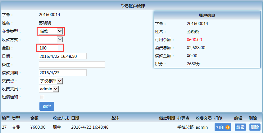 案例:学员“苏晓晓”想要报两门课程,“商务英语一级”400元/门和2课时“古筝一级”100元/课时,那么收费流程是:先录入报名基本信息,然后进入“消费明细单”(具体操作请参看“如何报名、收费”),录入所报课程,加上“空调费”等杂费,共需700元,而她却只带了600元,那么这里就要注意了,不可勾上“即充即扣”,应该点“账户充值”,进入“学员账户管理”,录入实收的600元费用,“交费类型”选择“交费”,金额为600;然后再录入一条借款信息,“交费类型”选择“借款”,金额为100,输入“借款到期日”,即可完成借款操作,然后把这个“学员账户管理”页面关掉后正常确认结账,完成收费流程。