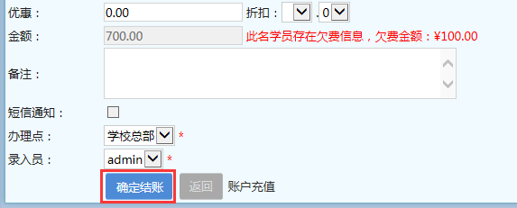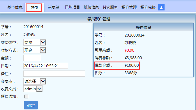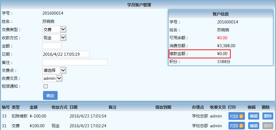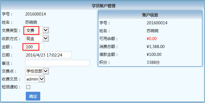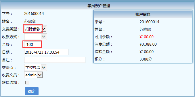 到了2016年4月23日的时候,她准时来补交欠费了,这时,只需在【财务】→【欠费记录查询】这里点“充值记录”即可进入“学员账户管理”,先录入一条交费信息100元,然后再录入补交信息,交费类型选择“扣除借款”,金额输入“-100”,即可完成补交;也可在【财务】→【学员列表】-【账户】进入“学员账户管理”。这里要注意的是,学员帐户有余额才可以扣除借款,补交欠费的步骤是先交费再扣除借款。