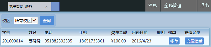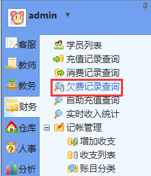 此时,这名学员就处于欠费状态,可在【财务】→【欠费记录查询】里看到此学员: