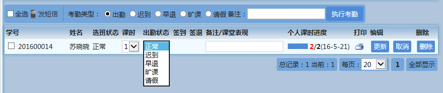 d.【教务】→【出勤管理】→【今日签到】→点“签到”,编辑状态及课时;
