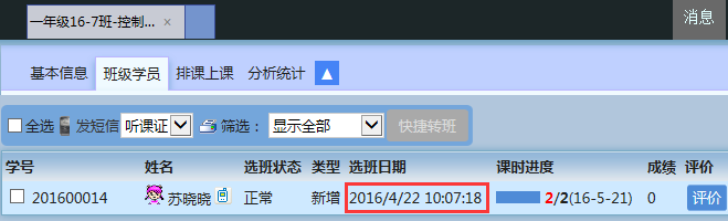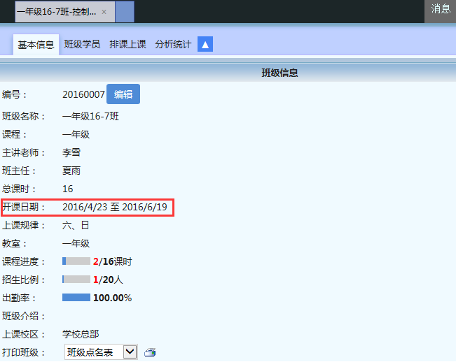 这里需要注意的是,当学员名单簿没有名字的时候,请检查班级“基本信息”里的“开课日期”和“班级学员”里的“选班日期”之间的先后关系,比如:班级“一年级16-7班”开课日期是“2016/4/23至2016/6/19”,假如学员“苏晓晓”在“2016/4/24”加入此班,那么当2016/4/23日点名时,学员名单簿就不会出现她的名字,这种情况正常考勤是不会出现的,当录入旧资料或有插班学员时需要注意。
