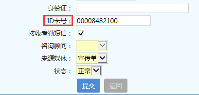 a.学员刷卡考勤:首先给学员设置ID卡号,一个学号对应一个卡号,新生可在报名时即在其基本信息里输入ID卡号,对于报名时未绑定ID卡号学员,请打开【教务】→【学员管理】→【学员列表】找到此学员→编辑基本信息,录入ID卡号。ID读卡器是即插即用的,直接把光标点在“ID卡号”文本框里,直接刷卡就可以输入卡号了。