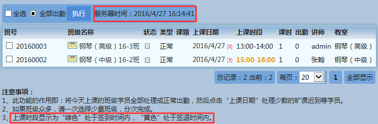 有一个简便的方法来判断是否在刷卡考勤有效时间内,在【教务】→【出勤管理】→【今日上课】检查“上课时段”,并且注意服务器时间和当前客户端时间是否相同:
