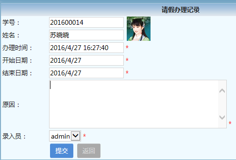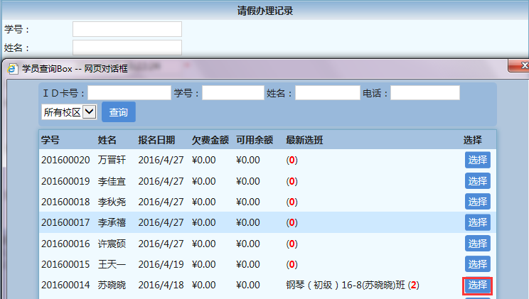 请假手续办理有两处可以进入,一是【教师】→【请假登记】,二是【教务】→【学员管理】→【请假登记】;输入学号或点姓名文本框查找到此学员,输入请假开始时间及结束时间,输入原因,完成手续办理。