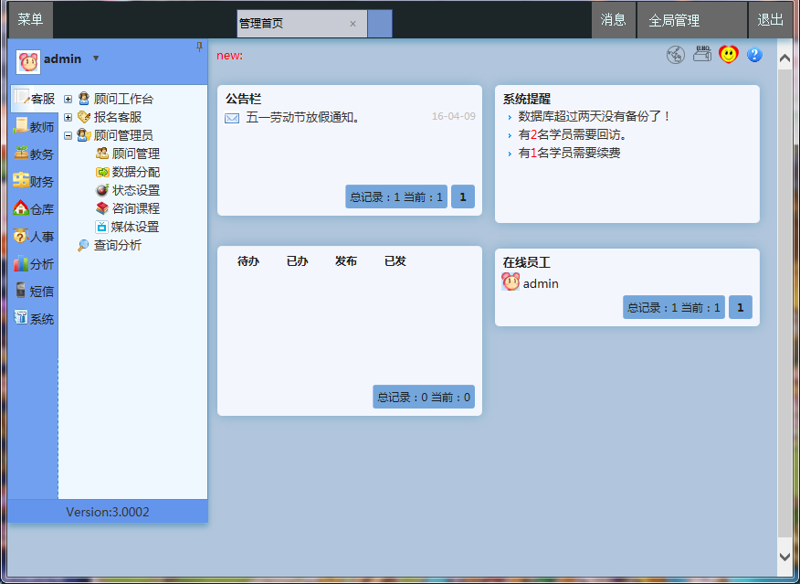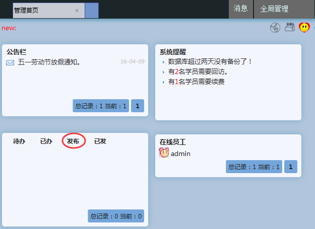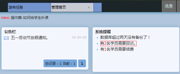 这样在标签栏上就出现了两个标签,可以随意切换,比如我们现在想回到【管理首页】查看提醒信息,只需要点击【管理首页】就可以了,然后在首页上点击提醒内容: