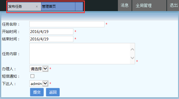 在这里您需要详细了解的是麦田3.0的多标签操作模式,也就是说可以在一个窗体内打开多个操作页面,同时处理事务,提高工作效率;比如我们现在需要发布任务,点击【发布】: