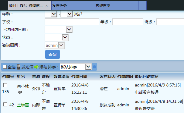 如果我们处理好了回访信息,可以直接把【顾问工作台】这个标签关掉就可以了,然后可以继续处理之前的事务,有的用户平时处理事务太多,会打开较多的标签,或者有的标签没有及时关掉,会出现下面这样的情况: