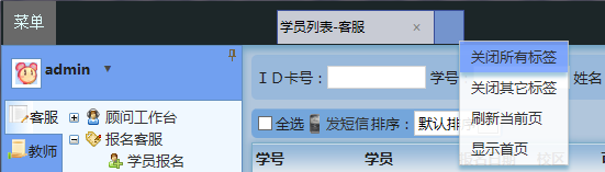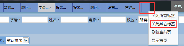 这时,可以把鼠标停靠在标签上方,就会显示完整的标签名称;如果想只保留一个标签,关闭其他的标签,可以先选中需要保留的标签,然后点最右边的空白标签→关闭其他标签,而且当所有标签都被关闭的时候,包括【管理首页】也被关闭了的时候,这个空白标签依然存在,可以帮您显示管理首页:
