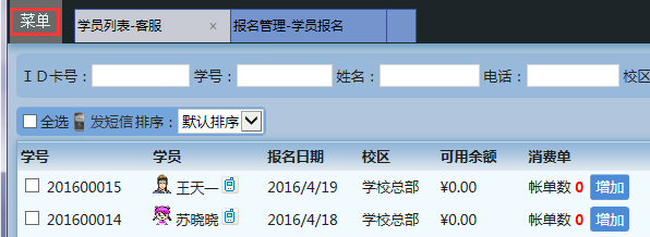 学员可以点击【咨询】,填写自己的意向信息,成为系统里的潜在生源;也可以直接点击【报名】,完善自己的资料正式报名,并可以在线充值,查询学校开设的班级,自助选班。