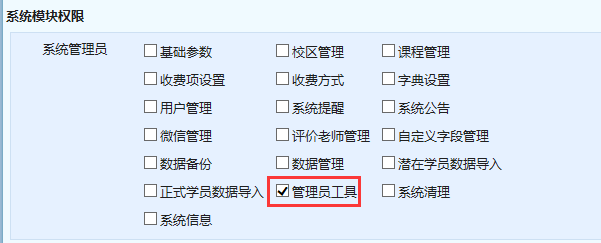 为了更高效的管理,系统还提供了一种快捷删除学员的工具,并把快捷删除学员的操作放在了【系统】→【管理员工具】里,而且设计了一个权限来控制这个工具的使用权,默认只有超级管理员组ID为1的系统管理员有此权限。