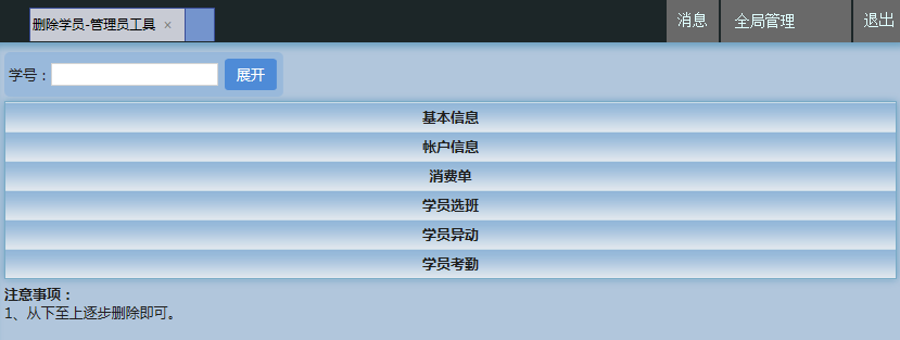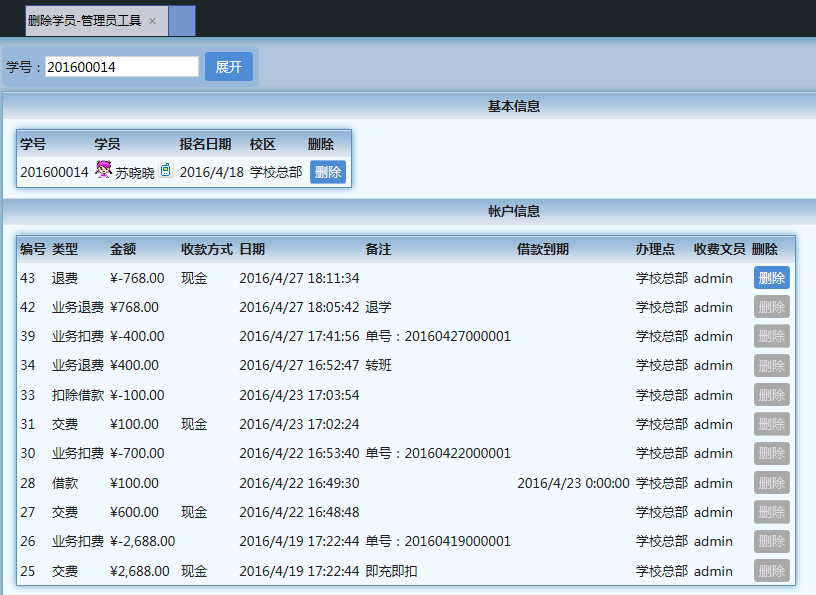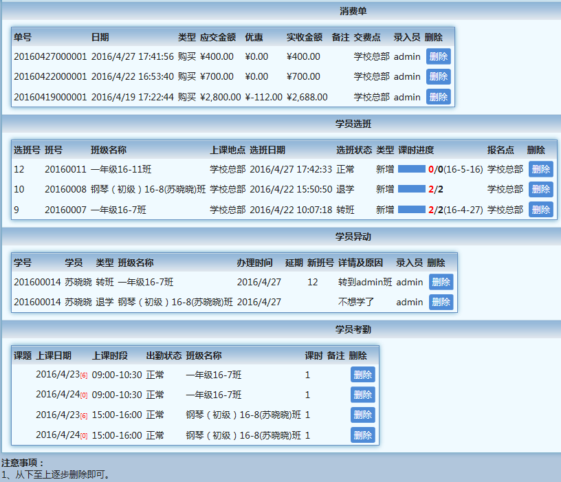 选择好需要删除的学员后,她的所有的消费记录、上课信息等数据会清清楚楚的全部出现在下方,然后从最下面的学员考勤记录开始删除,然后删除学员异动信息,接着删除学员选班信息,再删除消费单,再删除帐户信息,最后删除学员基本信息。