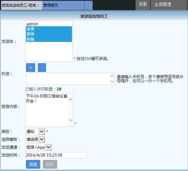 然后,打开【短信】→【短信用户】→【发送给同事】,选择发送者,即可发送。您也可以在抄送框中输入手机号,一起送出,多个请用“;”号隔开。修改发送时间,可以达到定时发送的目的。
