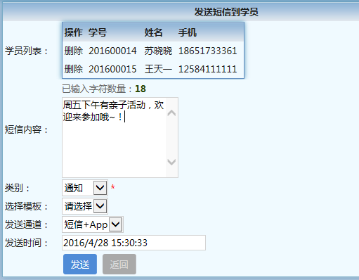 1、短信内容中支持如下变量:{学号}{姓名}{手机}{日期时间}{日期}{时间}。
