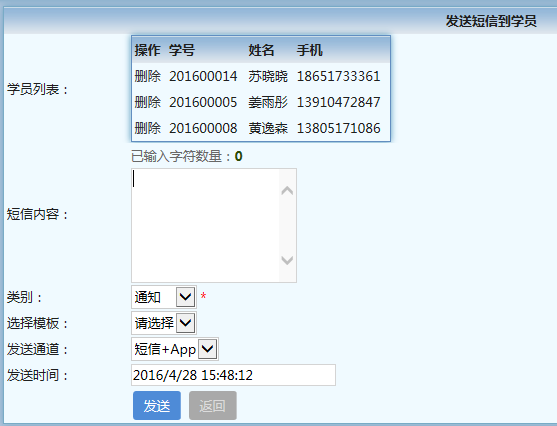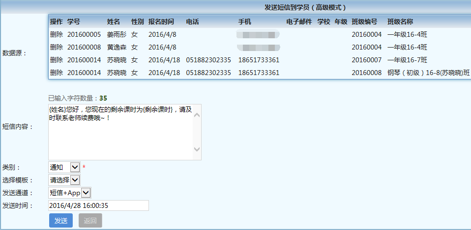 2、当接收者非自定义时同时支持如下变量:{学号}{姓名}{手机}{日期时间}{日期}{时间}。