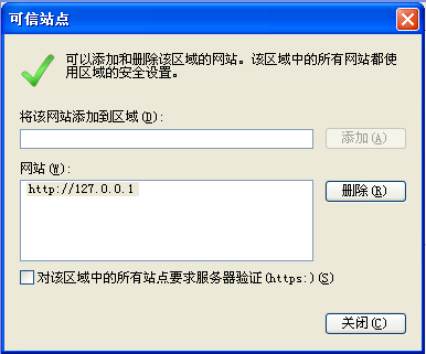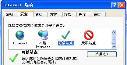 2、 选择“可信站点”,点击“站点”,将站点的域名加入列表。