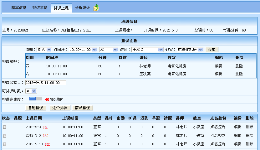 从上图我们可以看到,可以设置N种排课参数,不同周期、时段,不同教室,不同授课老师混合,支持按起始日期排课,支持可排课数量,逐个排课等。有了这个数据库基本,我们才能实现真正意义上的智能考勤。