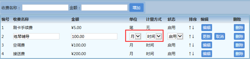 这里注意编辑一下单位和计量方式,比如空调费或接送费等,我们一般是按月收取,也就是以时间为计量方式,这是我们对学员所提供的除教学之外的其他服务,当这些收费项被设置为以时间为计量方式后,我们就可以在学员购买后对他们进行管理。